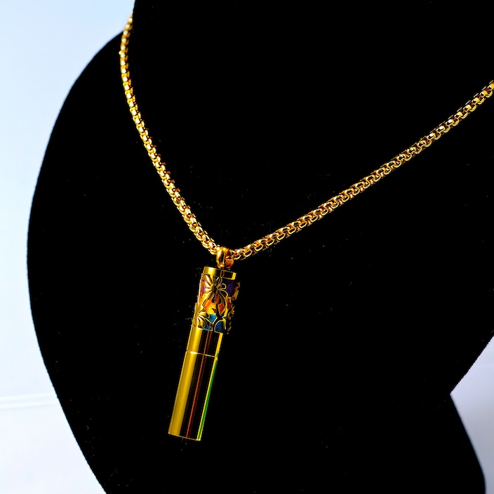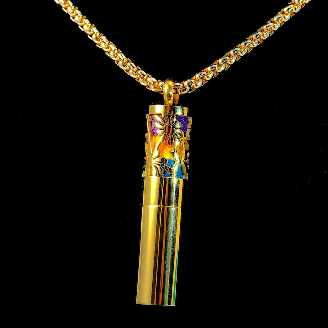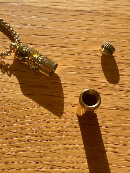 Le pendentif cylindrique doré (4 cm de haut, 7 mm de diamètre) se dévisse pour révéler 3 emplacements verticaux :