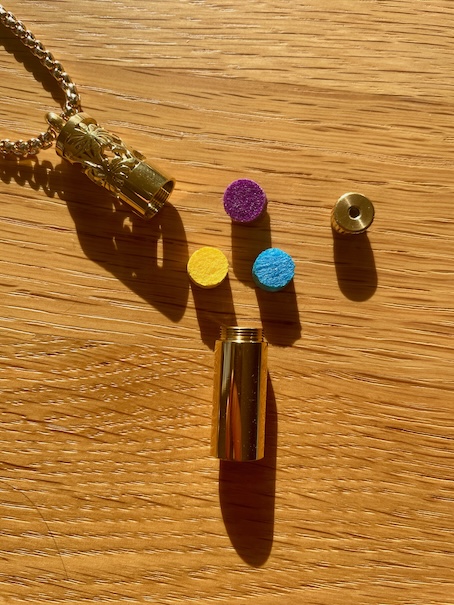 C’est exactement ce que vous offre ce collier aromathérapie révolutionnaire : un cylindre doré élégant de 4 cm qui contient 3 cylindres feutre empilés verticalement (haut/centre/bas), que vous pouvez personnaliser à l’infini.